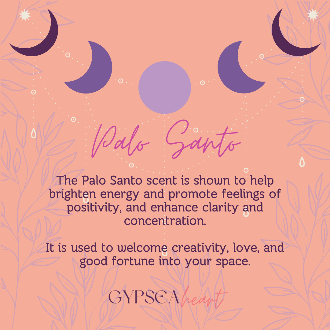 The Palo Santo scent is shown to help brighten energy and promote feelings of positivity, and enhance clarity and concentration.