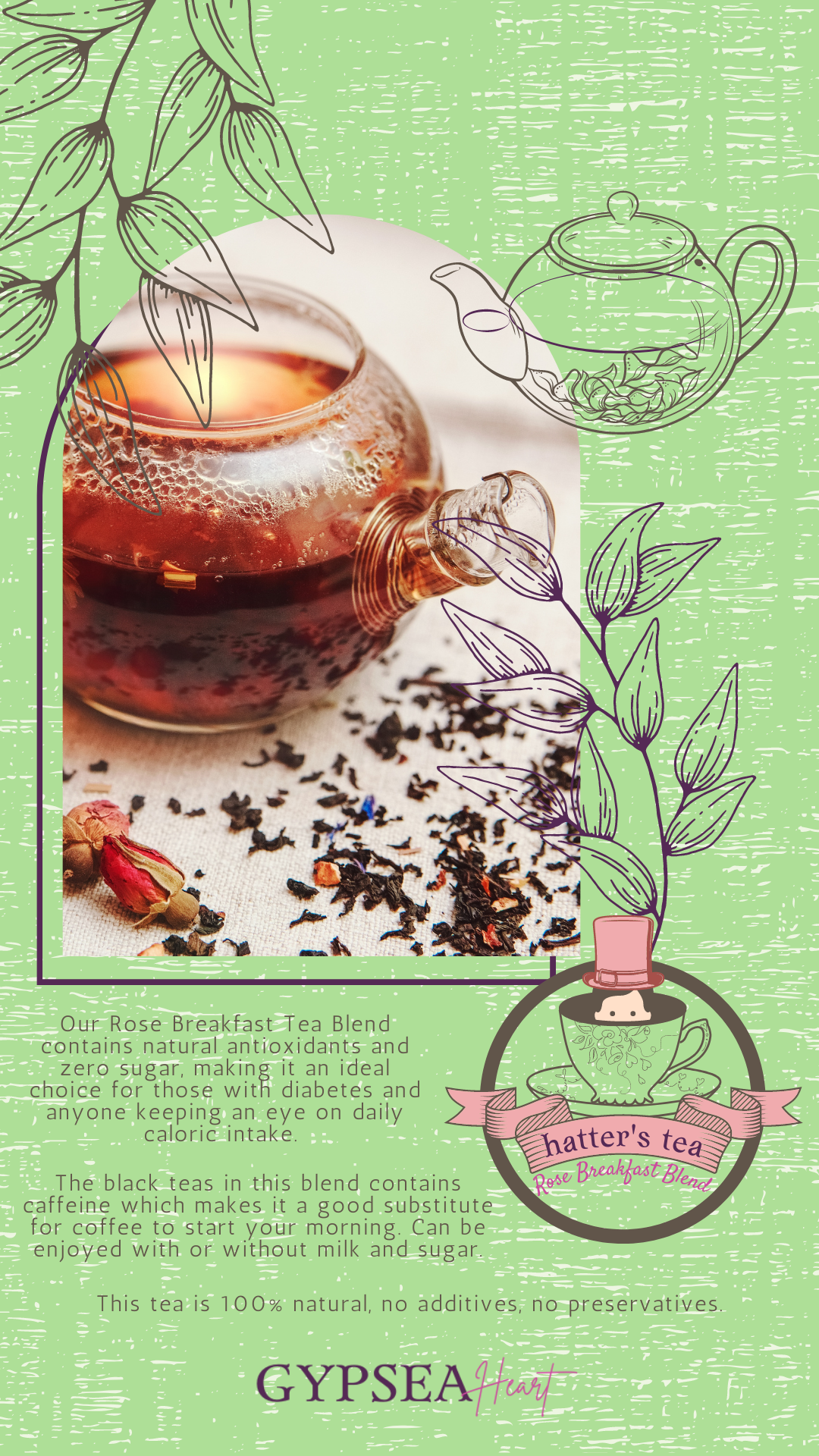 Our Rose Breakfast Tea Blend contains natural antioxidants and zero sugar, making it an ideal choice for those with diabetes and anyone keeping an eye on daily caloric intake.