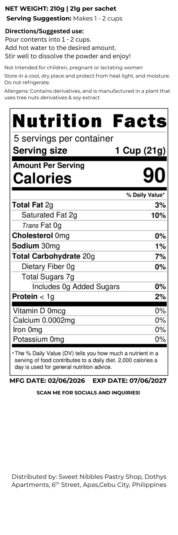 We care about our customers that's why Sweet Nibbles Cozy Coffee is not just coffee beans but has added benefits from Mangosteen, Guyabano, Ginseng, Gotu Kola and Spirulina plus some Stevia for some pinch of sweetness. Our coffee is made to not only help fuel your day but also make you feel refreshed, loved and cared for!
